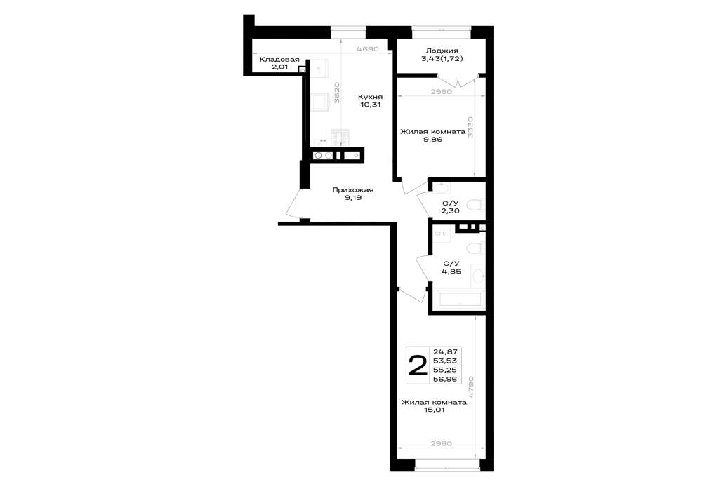 - Общая площадь 55.25 м²