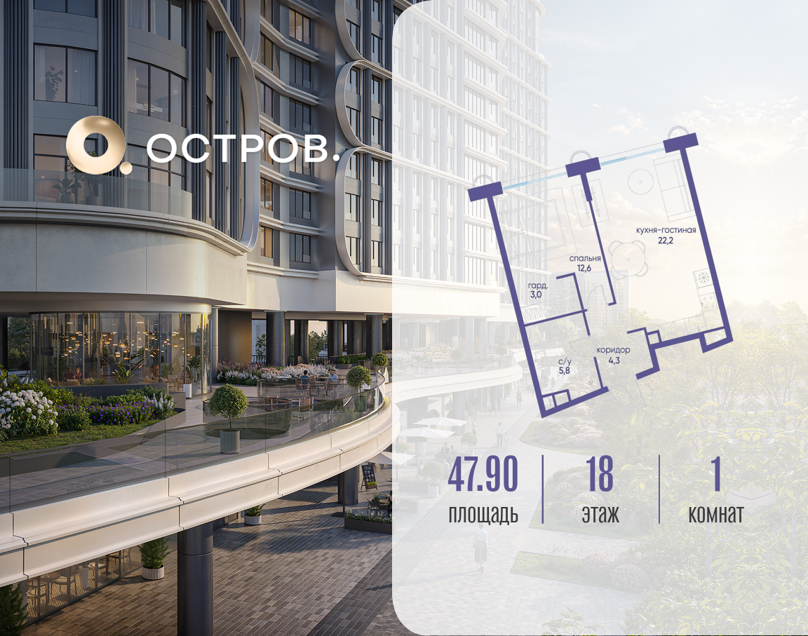 Продаётся однокомнатная квартира от застройщика: общая площадь 47.92 м², жилая 12.60 м², кухня 22.20 м², 18, жилой квартал «Остров 7», корпус 7 (7 квартал) (секция 2). срок сдачи: 4-кв. 2025. , 1 совмещенный санузел. В жилой зоне 2 больших окна на одну сторону, хорошая инсоляция. Позвоните сейчас и забронируйте квартиру! Купите квартиру в доме у прибрежного парка, в квартале ОСТРОВ.7. Это семь корпусов премиум- и бизнес-класса в одном из лучших мест ОСТРОВА - между бульваром и парком, поблизости от реки. Стильные корпуса имеют узнаваемый вид благодаря бионической пластике фасадов, приподнятых над землей. Для жителей предусмотрены детский клуб, фитнес-рум, коворкинг, переговорные, лаунжи. На крышах устроены видовые общественные пространства с зонами для отдыха и спорта. Двор расположен на двух уровнях: нижний ландшафтный парк и верхняя городская терраса. ОСТРОВ.7 - часть жилого комплекса на западе Москвы, в 15 минутах езды от центра. Это настоящий заповедник посреди большого города, в окружении реки и 650 га заповедников. Здесь все необходимое находится по соседству: от детского сада до супермаркета, от фитнес-зала до серфинг-центра. На территории созданы все условия для отдыха и общения: клубная инфраструктура в домах и дворы-парки, набережные и променады, маршруты для спортсменов, детей и возрастных жителей. В нескольких минутах ходьбы расположена станция метро "Терехово" БКЛ. На автомобиле - 10 минут до Москва-Сити и 15 минут до Садового кольца.