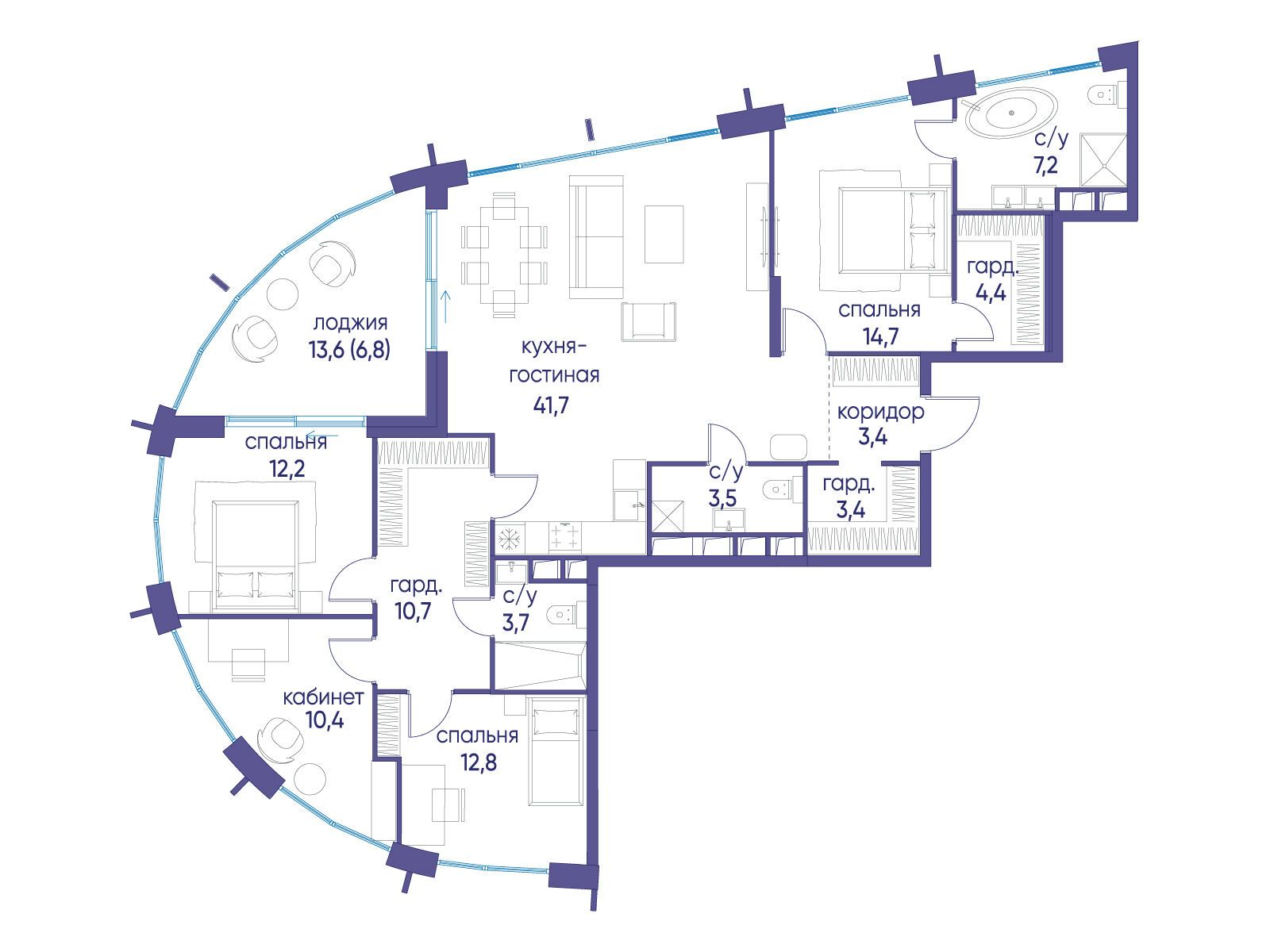 Продаётся четырехкомнатная квартира от застройщика: общая площадь 134.92 м², жилая 50.10 м², кухня 41.70 м², 6, жилой квартал «Остров 7», корпус 3 (7 квартал) (секция 2). срок сдачи: 4-кв. 2025. , 3 санузла: 1 раздельный и 2 совмещенных. В жилой зоне 2 больших окна на одну сторону, хорошая инсоляция. Позвоните сейчас и забронируйте квартиру! Купите квартиру в доме у прибрежного парка, в квартале ОСТРОВ.7. Это семь корпусов премиум- и бизнес-класса в одном из лучших мест ОСТРОВА - между бульваром и парком, поблизости от реки. Стильные корпуса имеют узнаваемый вид благодаря бионической пластике фасадов, приподнятых над землей. Для жителей предусмотрены детский клуб, фитнес-рум, коворкинг, переговорные, лаунжи. На крышах устроены видовые общественные пространства с зонами для отдыха и спорта. Двор расположен на двух уровнях: нижний ландшафтный парк и верхняя городская терраса. ОСТРОВ.7 - часть жилого комплекса на западе Москвы, в 15 минутах езды от центра. Это настоящий заповедник посреди большого города, в окружении реки и 650 га заповедников. Здесь все необходимое находится по соседству: от детского сада до супермаркета, от фитнес-зала до серфинг-центра. На территории созданы все условия для отдыха и общения: клубная инфраструктура в домах и дворы-парки, набережные и променады, маршруты для спортсменов, детей и возрастных жителей. В нескольких минутах ходьбы расположена станция метро "Терехово" БКЛ. На автомобиле - 10 минут до Москва-Сити и 15 минут до Садового кольца.