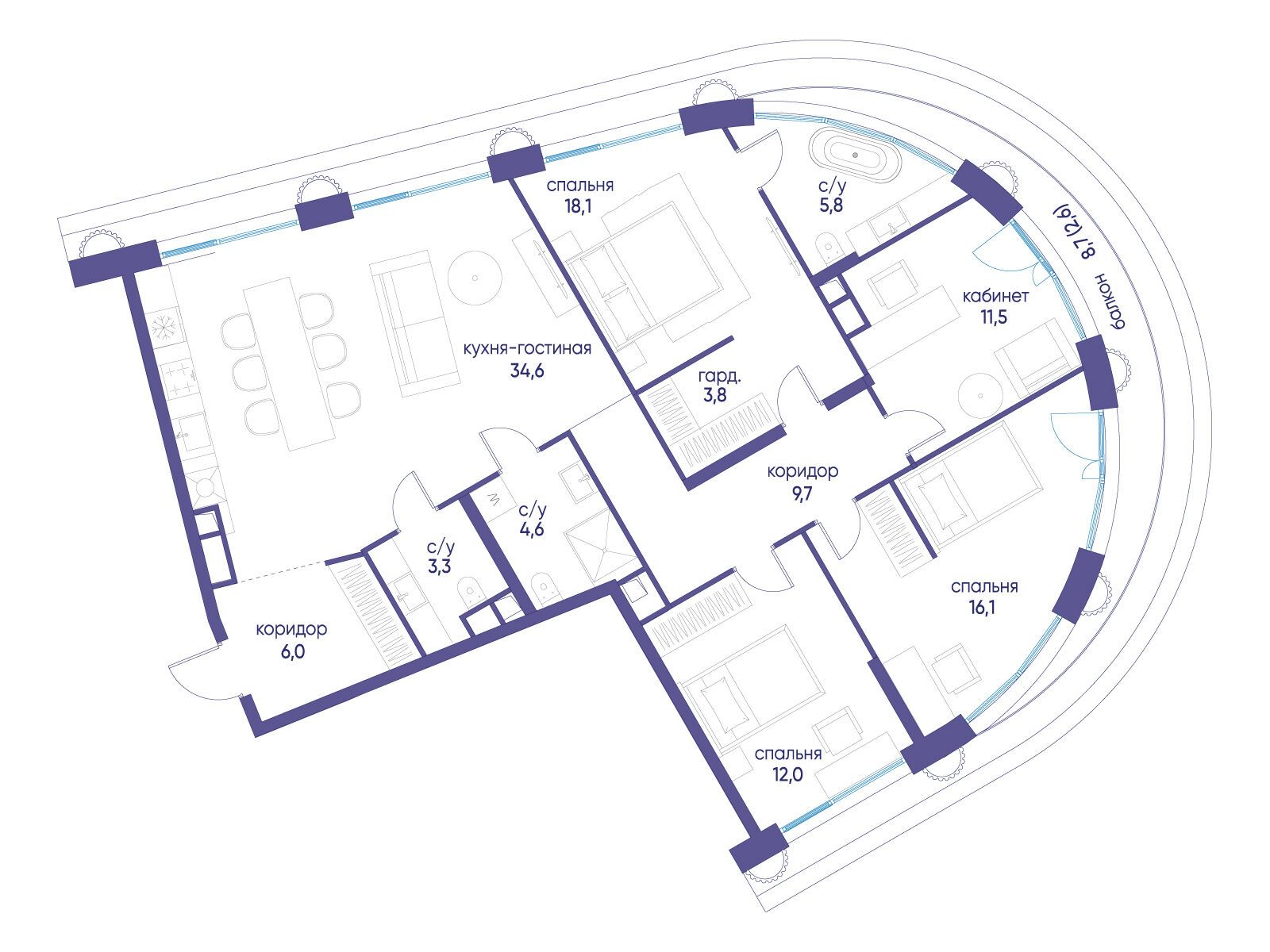 - Площадь кухни 34.6 м²